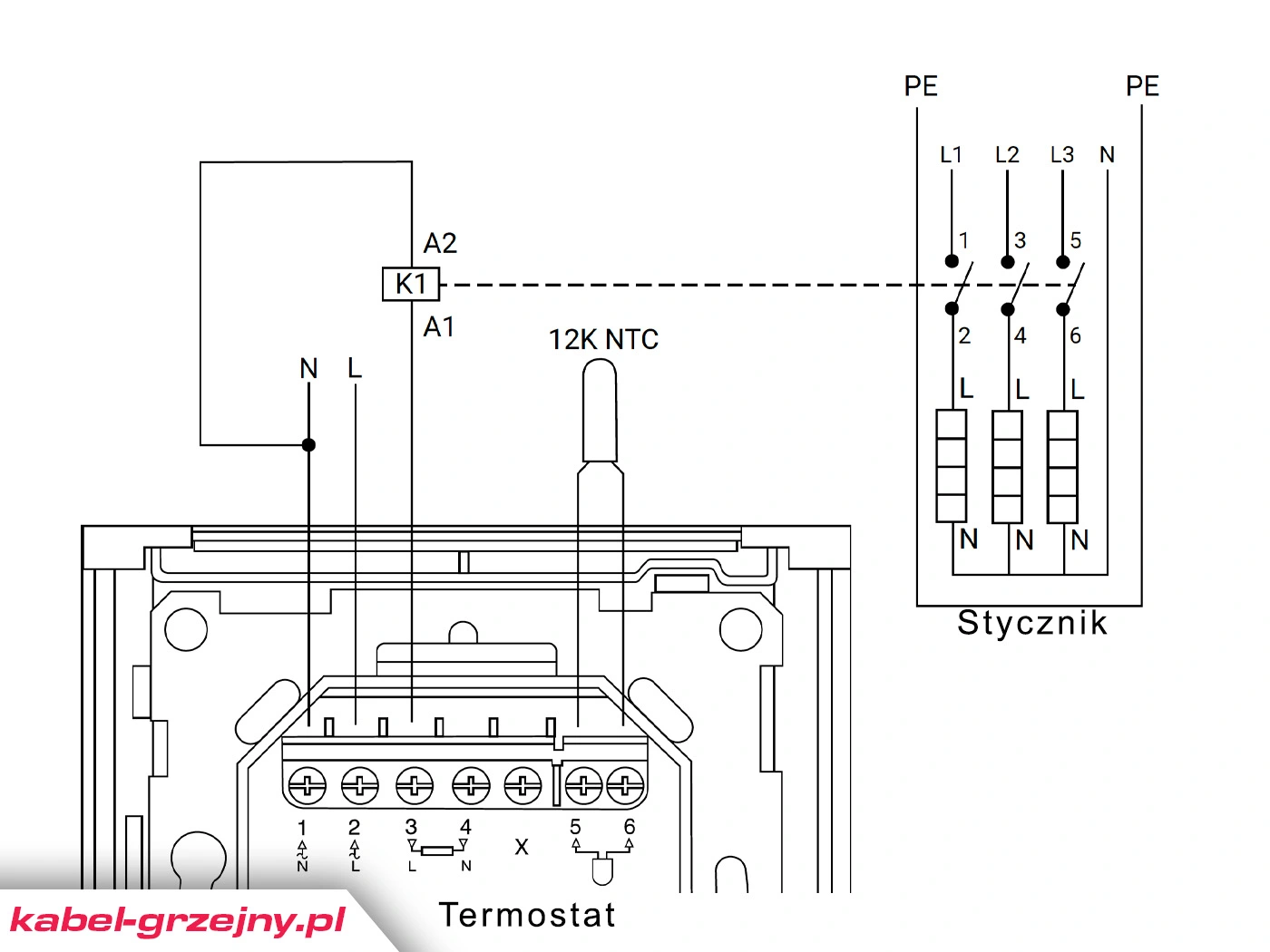 Schemat podłączenia termostatu przez dodatkowy stycznik