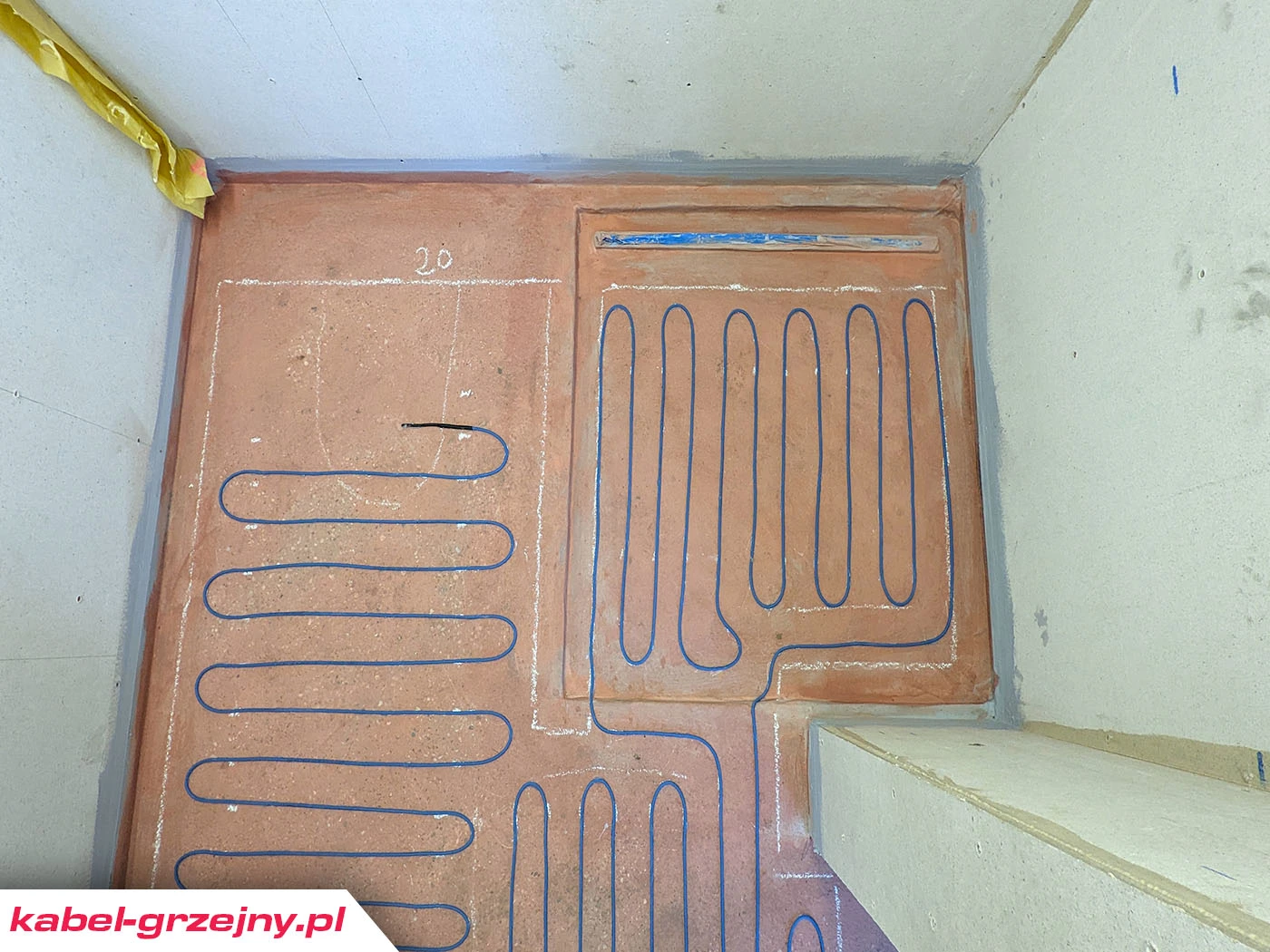 - Wyznacz strefę grzewczą na podłodze uwzględniając stałą zabudowę i miejsca w których mogą być wiercone otwory w podłodze. Stosując kabel grzejny o mocy 10 W/m odsuń się min 5 cm od ścian a od odpływu pod prysznicem min 8 – 10 cm. Kabel zainstalowany zbyt blisko syfonu może przyspieszać wysuszanie w nim wody.